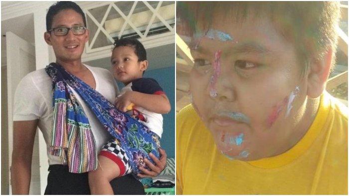 Pengusaha sekaligus triliuner, Sandiaga Uno (50) berbincang dengan Rizal (12), penjual jalangkote di Pangkep, Sulawesi Selatan atau Sulsel, yang menjadi korban bully.