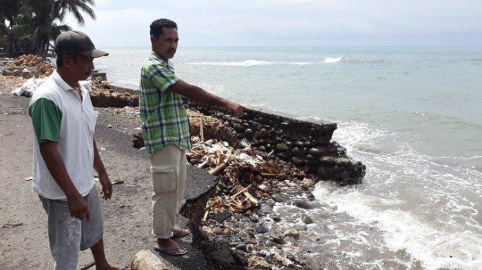 "Ini sudah empat hari begini naik gelombang pasang pak, sudah mulai rusak badan jalan hampir putus dan permukiman warga terancam hilang kata salah seorang warga Banyoro, Suriani, Senin (8/6/2020).