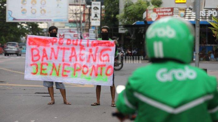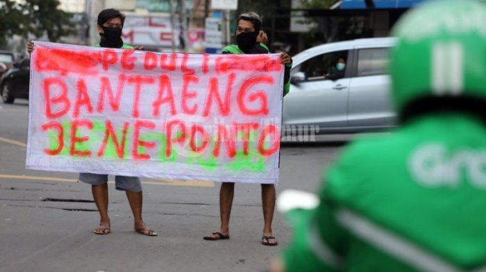 Dua Driver Ojek Online memegang spanduk bertuliskan Peduli Bantaeng Jeneponto di perempatan traffic light Jl Ahmad Yani, Makassar, Sabtu (13/6/2020).
