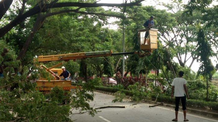 TRIBUN TIMUR.COM, GOWA - Pekerja melakukan pemangkasan ranting pohon di Jl Tun Abd Razak, Gowa, Sulsel, Jumat (19/6/2020).