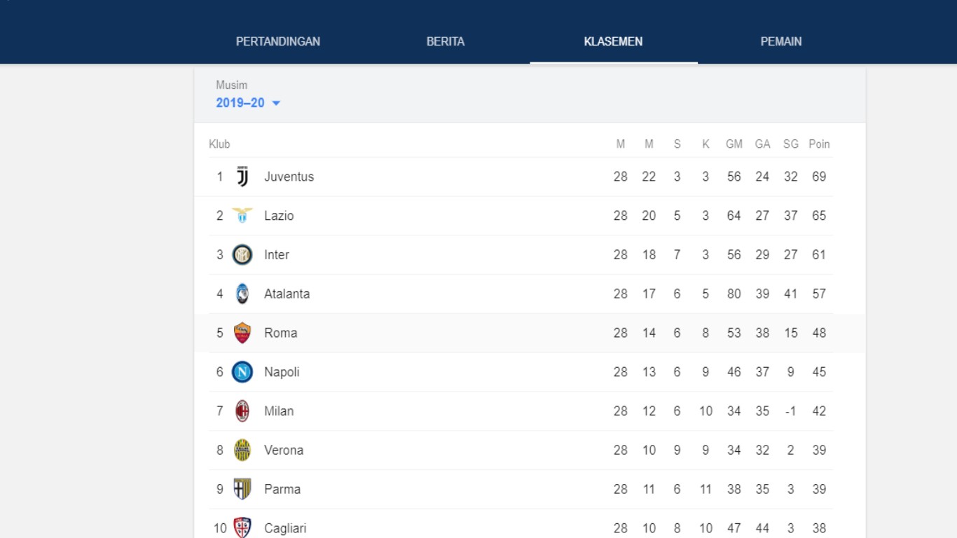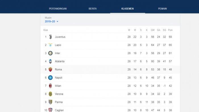 Berikut ini hasil Klasemen sementara Liga Italia 2020. Tim sepakbola Juventus masih kokoh di puncak. Inter Milan di posisi 3 seentara AC Milan masih t