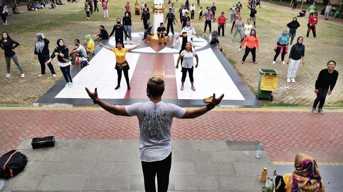 Kawasan Taman Pakui Sayang dijadikan sebagai tempat berolahraga warga selama pandemi dengan tetap menjalankan protokol kesehatan pencegahan