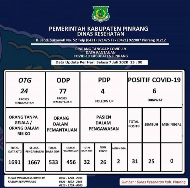 Saat ini, total pasien sembuh Covid-19 di Kabupaten Pinrang menjadi 25 orang dari 31 kasus positif yang terdata. Berarti sisa 6 pasien yang masih dalam perawatan.