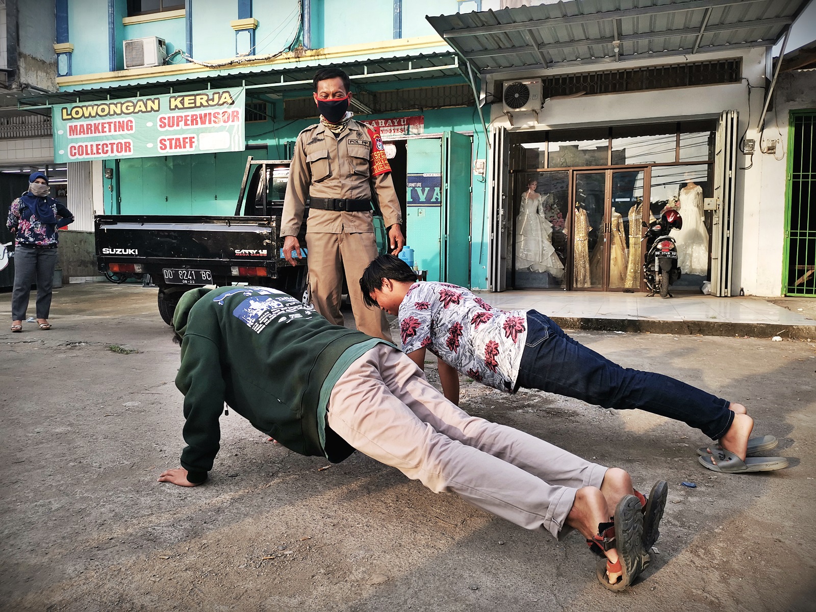 Warga yang kedapatan beraktivitas tanpa menggunakan masker diberi saksi sosial berupa push up dan dibagikan masker gratis serta disosialisasikan terkait perda tersebut.
