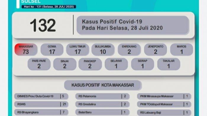 Dilansir data yang dikirimkan tim konsultan Gugus Tugas Percepatan Penanganan Covid-19 Sulsel, Selasa (28/7/2020) malam memperlihatkan, jumlah kasus pada hari ke-131 pandemi Covid-19 hadir di Sulsel, terjadi kenaikan 132 pasien menjadi 9.174 pasien.