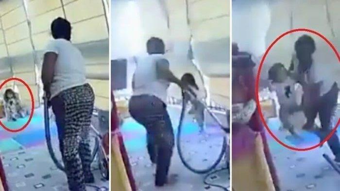 Dalam video, wanita yang dipercaya adalah seorang Asisten Rumah Tangga (ART) itu terlihat sedang membersihkan lantai dengan vacuum cleaner sementara ada anak kecil sedang bermain di dekatnya.