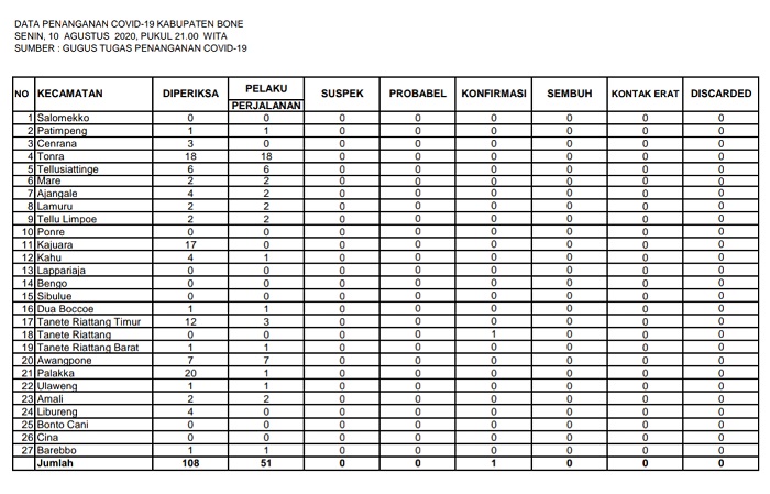 Dalam rilis bone.go.id pada Senin (10/8/2020) pukul 21.00 Wita ada satu penambahan pasien terkonfirmasi positif Covid-19.