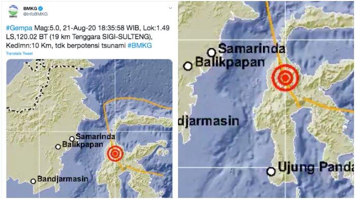 TRIBUN-TIMUR.COM - Gempa bumi 5,0 SR guncang Sigi, Sulawesi Tengah ( Sulteng ), Jumat (21/8/2020) malam.