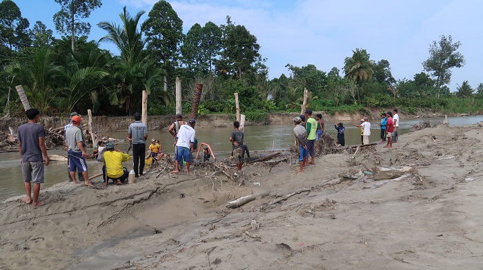 Dengan peralatan seadanya mereka bahu membahu memasang tiang kayu di tepi sungai.