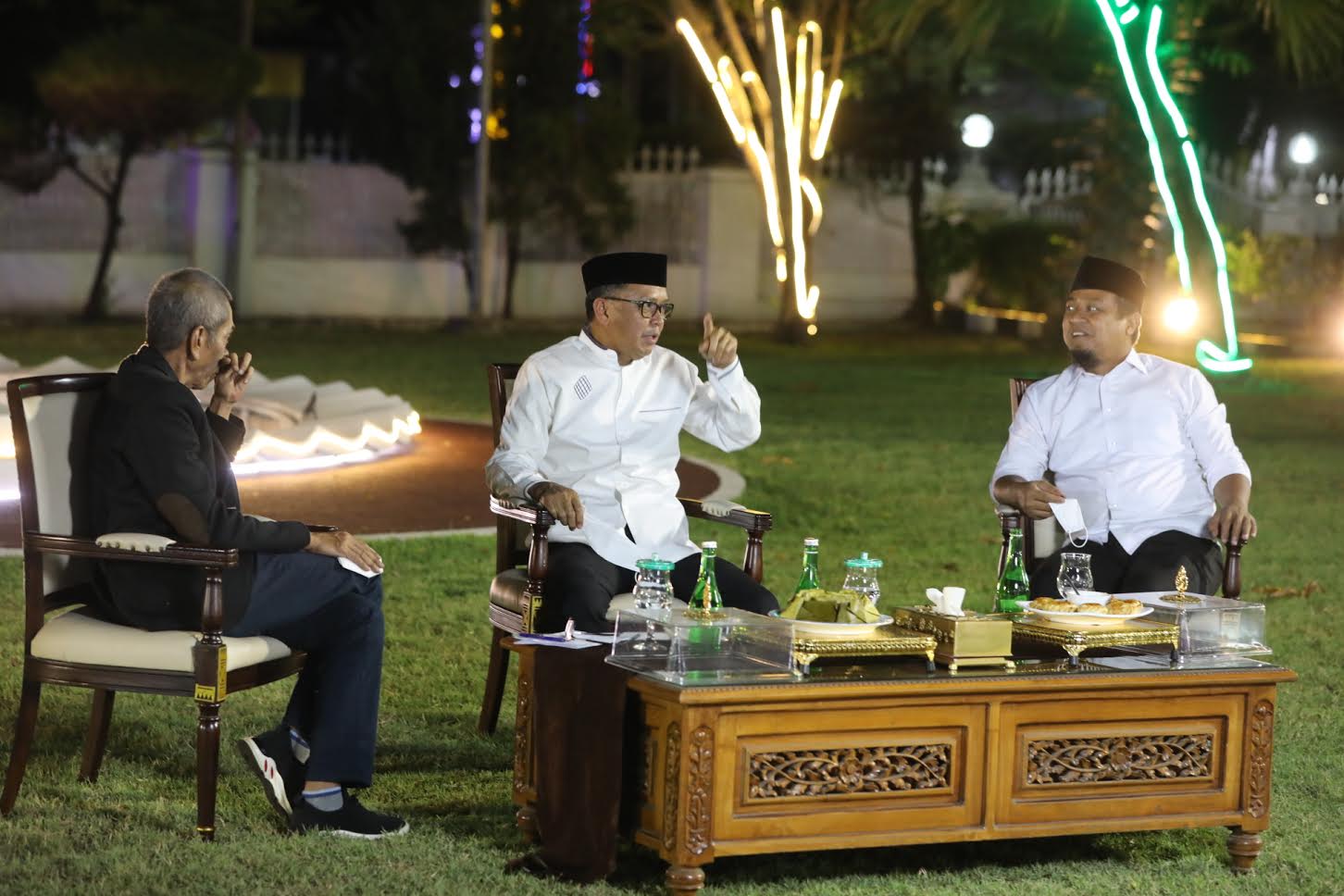 Pimpinan Umum Tribun Timur Andi Suruji (kiri) memandu wawancara khusus dengan Gubernur Sulsel, Nurdin Abdullah dan Wakil Gubernur Sulsel, Andi Sudirman Sulaiman di halaman Rumah Jabatan Gubernur Sulsel, Jl Jend Sudirman, Makassar, Jumat (4/9/2020) malam.