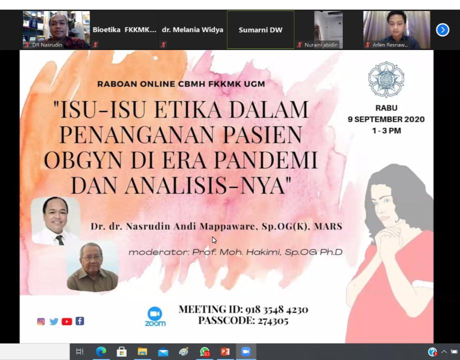 Pada minggu ini, topik yang diangkat adalah Isu-isu Etik dalam Penanganan Kasus Obstetri dan Ginekologi di masa pandemi COVID-19, dan alhamdulillah sebuah kehormatan dan kepercayaan bahwa CBMH FK-KMK UGM mengundang Wakil Dekan 1 FK UMI yang juga Pengampuh Bietika secara khusus sebagai narasumber tunggal atau pakar pada diskusi online ini.