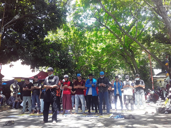 Salat berjamaah itu dilakukan di sela-sela aksi demonstrasi penolakan UU Omnibus Law Cipta Kerja.