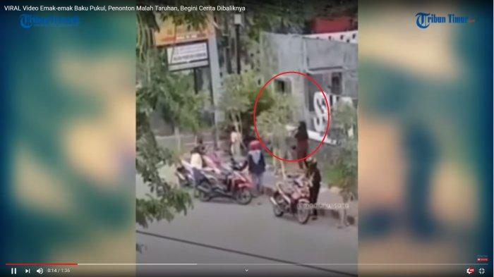 Seorang perempuan terlihat melerai dua emak-emak itu. Namun, mereka tetap saling pukul.