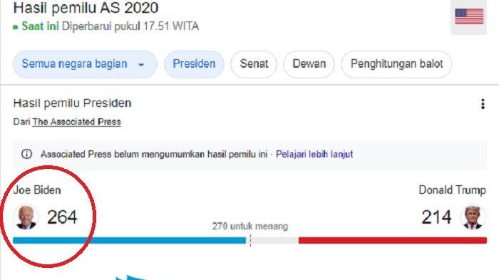 TRIBUN-TIMUR.COM - Update Hasil Pilpres Amerika hari ini / Pilpres AS terkini sementara Donald Trump kalah, Joe Biden menang