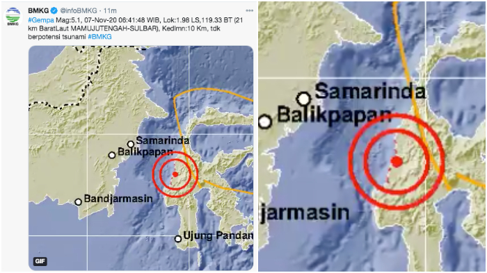TRIBUN-TIMUR.COM - Gempa bumi 5,1 SR terjadi di Mamuju Tengah, Sulawesi Barat, Sabtu (7/11/2020) pagi.