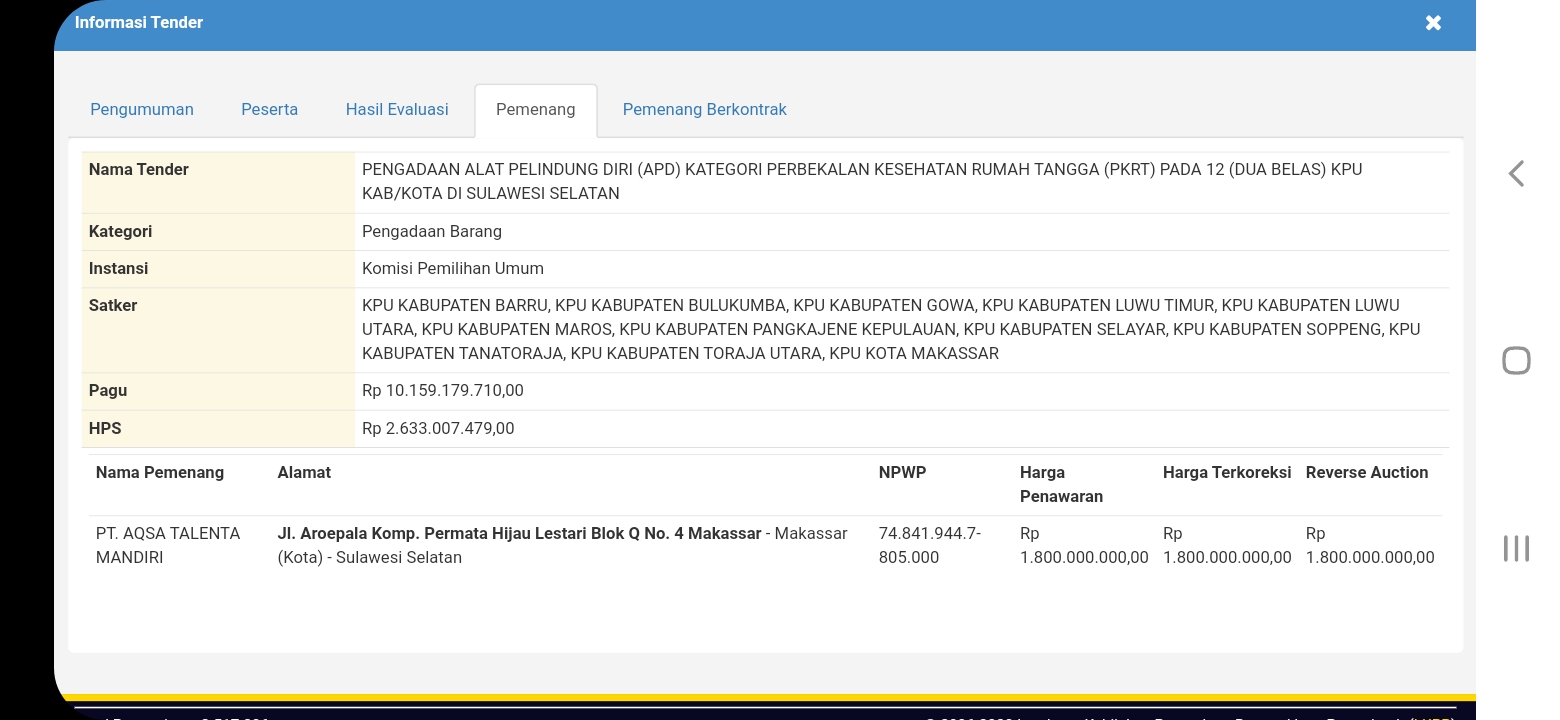 Dilansir lpse.kpu.go.id, tender pengadaan APD kategori PKRT pada 12 kabupaten/kota di Sulsel berpagu Rp 10.159.179.710 dengan Harga Perkiraan Sendiri Rp 2.633.007.478.