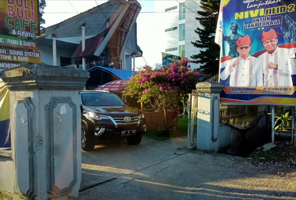 Randis Welem terekam kamera terparkir di halaman posko Induk pemenangan pasangan Nicodemus Biringkanae-Victor Datuan Batara (Nico-Victor).