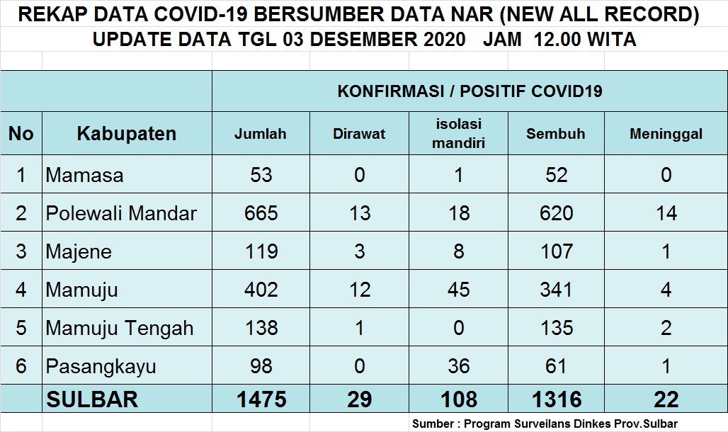 TRIBUN-TIMUR.COM, MAMUJU - Kabar kembira, 14 pasien Covid-19 di Sulawesi Barat dinyatakan sembuh hari ini, Kamis (3/12/2020).