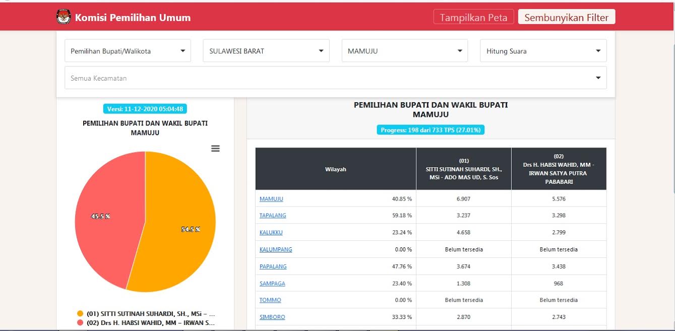 Hasil Sementara Pilkada Mamuju - Data Masuk di Portal KPU: Tina-Ado 54,5 %, Habsi-Irwan 45,5 %