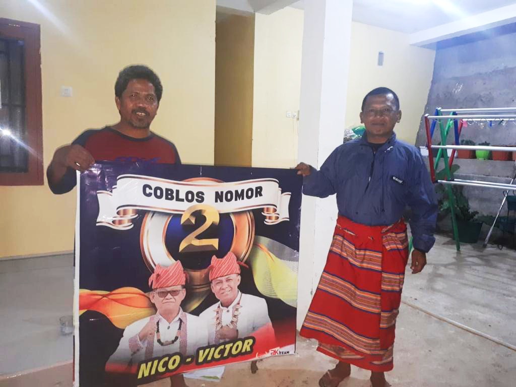 JT kedapatan berswafoto bersama seorang warga sambil memamerkan sebuah spanduk pasangan petahana Nico-Victor.