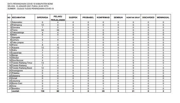 Dari data Tim Percepatan dan Pencegahan Covid-19 (PPC-19) Kabupaten Bone pada Selasa (12/1/2021) malam, jumlah terkonfirmasi positif ada 20 orang.