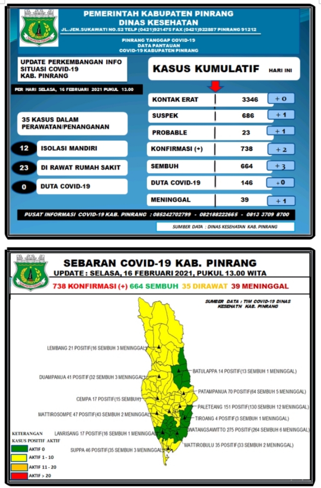 TRIBUNPINRANG.COM, WATANG SAWITTO - Dinas Kesehatan Kabupaten Pinrang menyampaikan perkembangan terbaru kasus Covid-19, Selasa, (16/02/2021).
