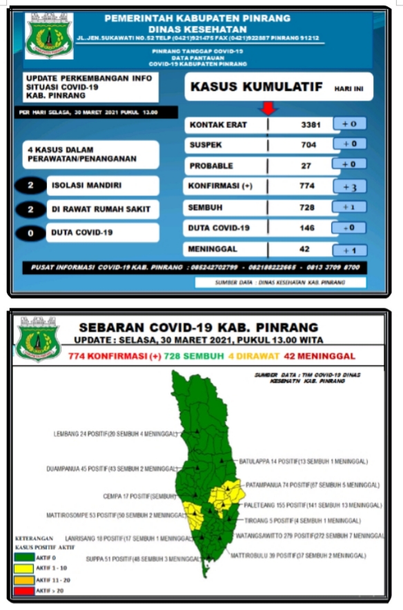 TRIBUNPINRANG.COM, WATANG SAWITTO - Dinas Kesehatan Kabupaten Pinrang menyampaikan perkembangan terbaru kasus Covid-19, Selasa, (30/03/2021).