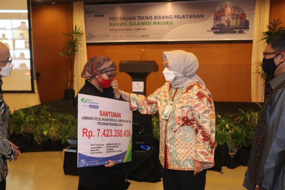 TRIBUN-TIMUR.COM, MAKASSAR-BPJS Ketenagakerjaan (BPJamsostek) Kantor Wilayah Sulawesi Maluku, menyerahkan santunan Jaminan Kecelakaan Kerja (JKK) dan Jaminan Hari Tua (JHT) sebesar Rp 7,4 Miliar, Jumat (9/4/2021).