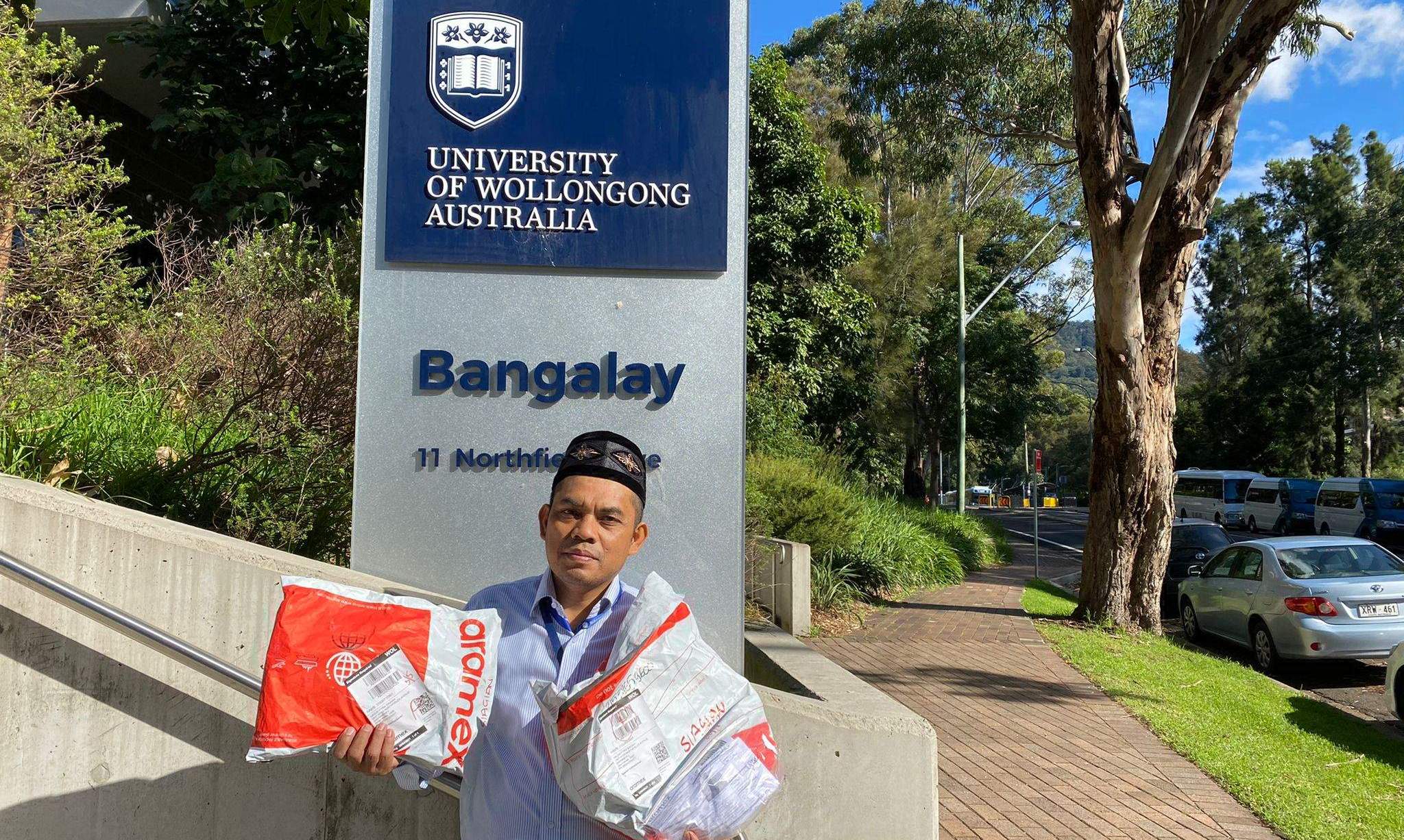 Ternyata bagian pengantaran dari jasa pengiriman, entah kenapa, membawa dan menitipkan paket ini ke kantor Pos Kampus Universitas Wollongong.