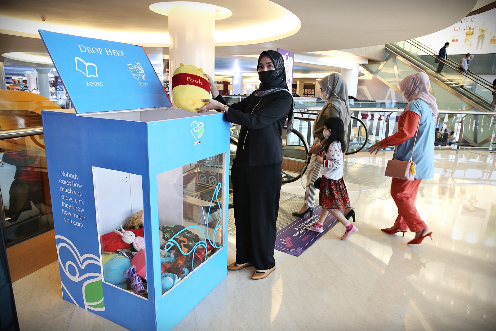TRIBUN-TIMUR.COM, MAKASSAR - Pengunjung mendonasikan mainan pada program “We Care” di Trans Studio Mall (TSM) Makassar, Selasa (8/6/2021).