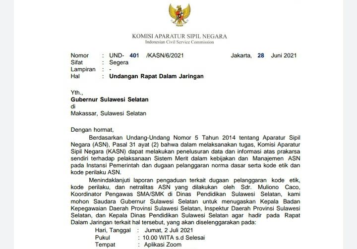 Kepala BKD Sulsel, Imran Jausi mengatakan, Komisi Aparatur Sipil Negara (KASN) mengirimkan surat kepada Plt Gubernur Sulsel Andi Sudirman Sulaiman prihal undangan rapat dalam jaringan (Daring) atau Zoom Meeting.
