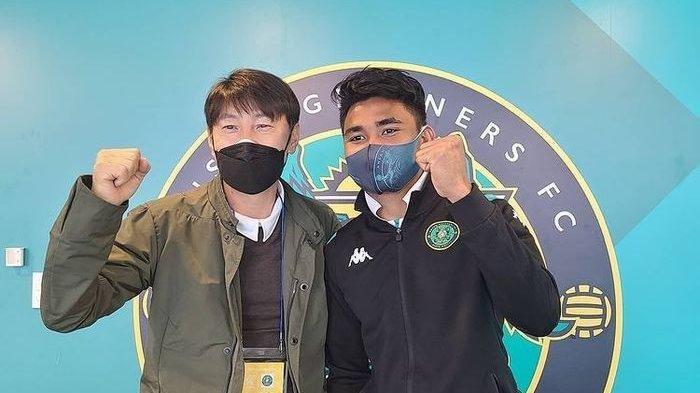 Pelatih timnas Indonesia, Shin Tae-yong, bertemu dengan Asnawi Mangkualam selepas laga antara Ansan Greeners dan Jeonnam Dragons pada Liga Korea 2.