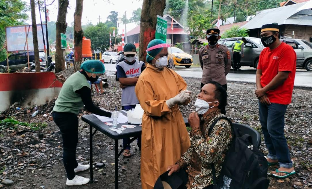 Para pengendara melakukan pemeriksaan swab antigen di Pos Siguntu.