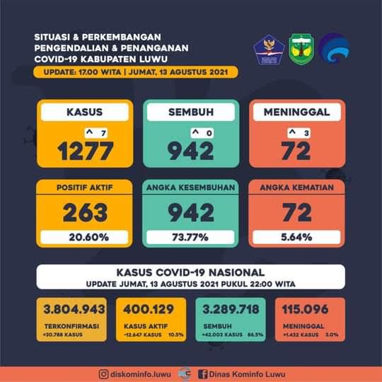 Itu berdasarkan data situasi dan perkembangan pengendalian penanganan Covid-19 Luwu, Jumat (13/8/2021).