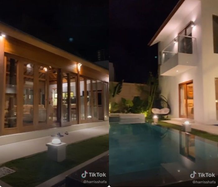 Terlihat di sana ada sebuah ruangan berbeda yang berada di seberang kolam renang.