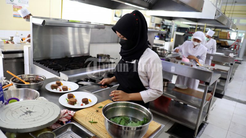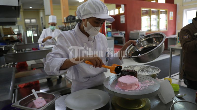 TRIBUN TIMUR.COM, MAKASSAR - Sejumlah mahasiswi Politeknik Pariwisata (Poltekpar) Makassar membuat kue di kampus Poltekpar Jl. Gn. Rinjani No.1, Tj. Merdeka, Tamalate, Makassar, Jumat (17/9/2021).