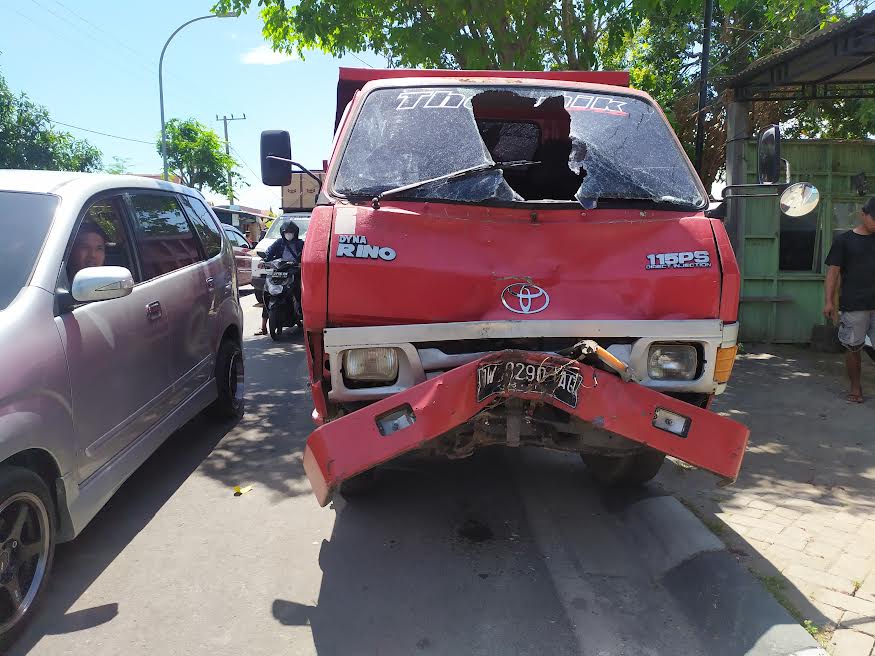 Kondisi sepeda motor rusak parah, sedangkan mobil truk rusak pada bagian depan dan kaca pecah.