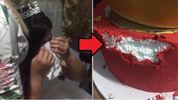 Puncaknya, tangis pengantin wanita pun pecah saat mengetahui kondisi kue pernikahannya.