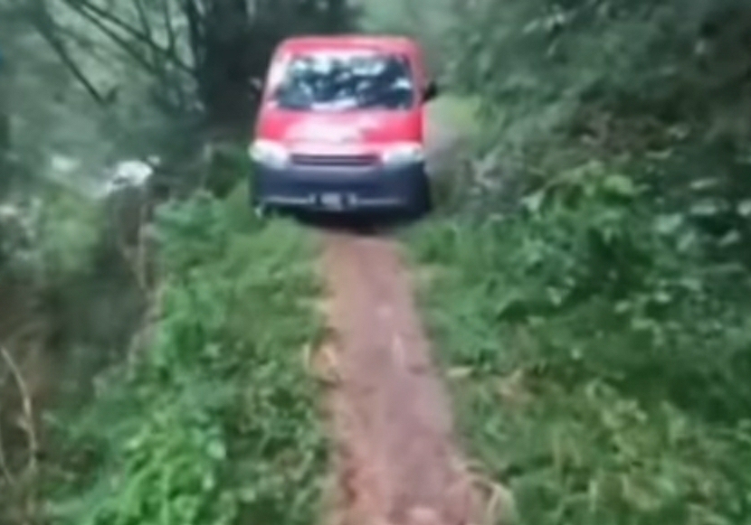 Dalam video tersebut terlihat si sopir memperlihatkan jalanan sempit dengan situasi kiri dan kanannya merupakan pepohonan liaknya hutam hijau.