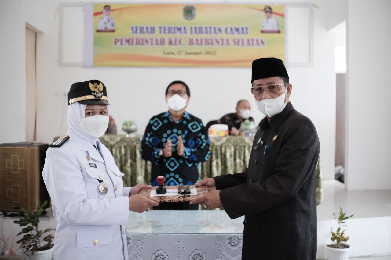 TRIBUNLUTRA.COM, BAEBUNTA SELATAN - Wakil Bupati Luwu Utara, Suaib Mansur menyaksikan serah terima jabatan dua camat, Kamis (27/1/2022).