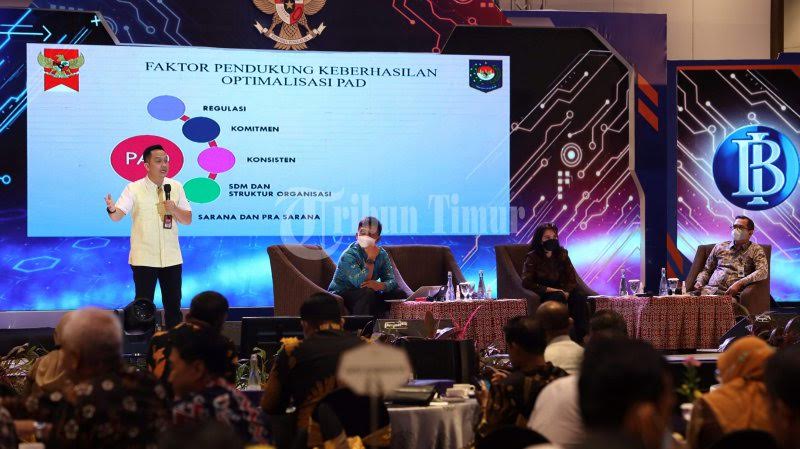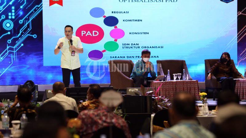 Analis Ahli Kebijakan Pendapatan Daerah, R An An Andri Hikmat (berdiri) menjadi narasumber pada Rapat Koordinasi Tim Percepatan dan Perluasan Digitalisasi Daerah (TP2DD) tahun 2022 yang berlangsung di Hotel Claro, Makassar, Jumat (4/3/2022). Kegiatan ini dihadiri oleh Perwakilan Otoritas Jasa Keuangan (OJK) Regional 6 Sulawesi, Maluku dan Papua. TRIBUN TIMUR/SANOVRA JR