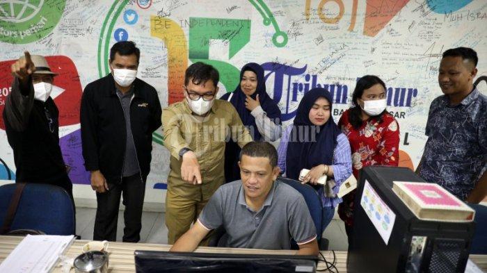 Kepala Dinas Kominfo-SP Kabupaten Luwu Timur, Hamris Darwis (kacamata) bersama timnya melihat proses editing berita saat bertandang keredaksi Tribun Timur, Jl Cendrawasih, Makassar, Selasa (8/3/2022).