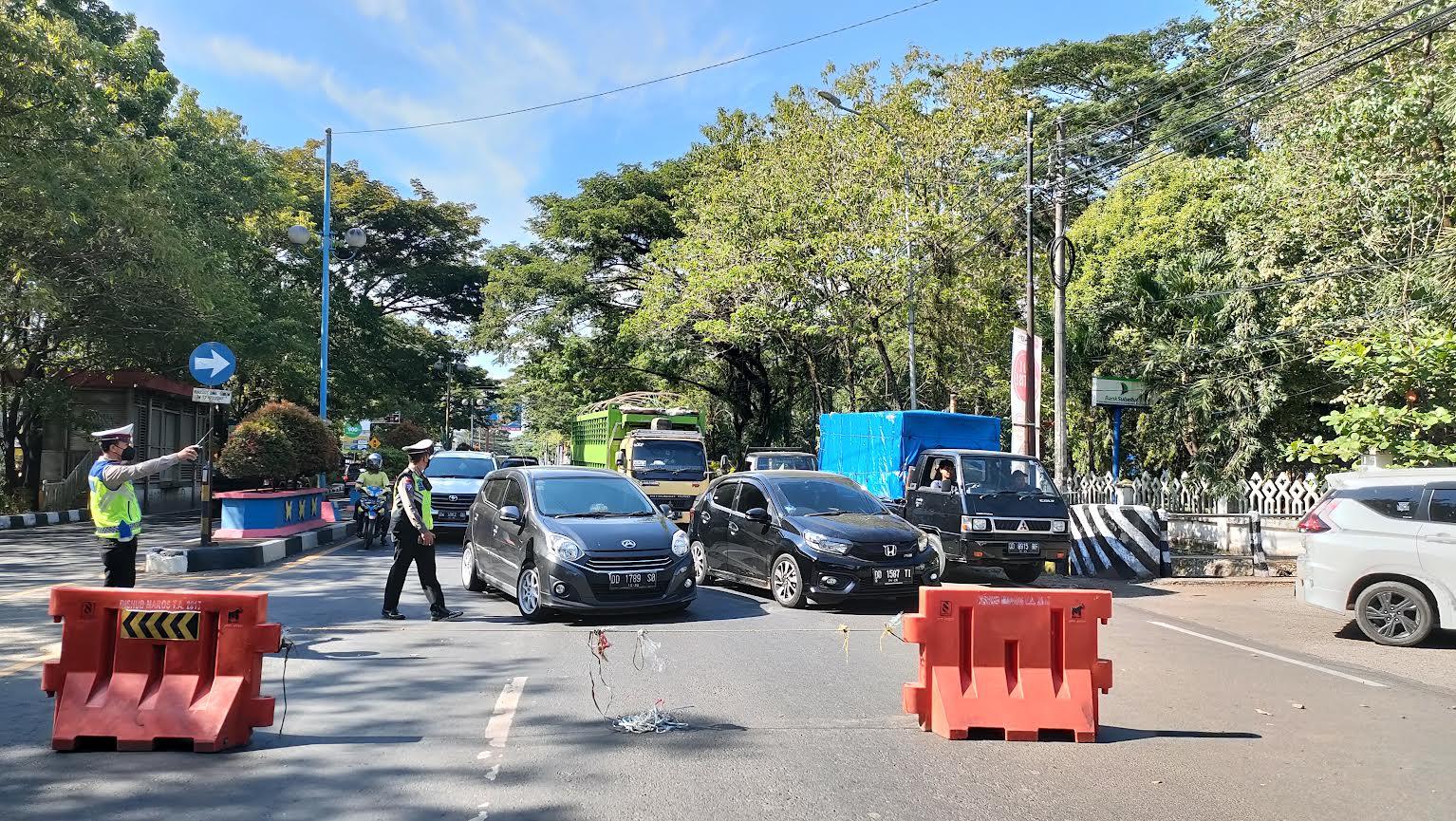 TRIBUNMAROS.COM, MAROS - Satlantas Polres Maros terpaksa mengalihkan arus lalu lintas di sekitaran Kantor Bupati Maros, Senin (11/4/2022).