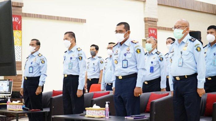 Kepala Kantor Wilayah Kementerian Hukum dan HAM Sulawesi Selatan, Liberti Sitinjak beserta jajaran Pimpinan Tinggi Pratama, dan seluruh Pegawai Kanwil Sulsel mengikuti kegiatan Penyerahan Zakat Fitrah Ramadhan 1443 H secara daring di Aula Kanwil Sulsel.