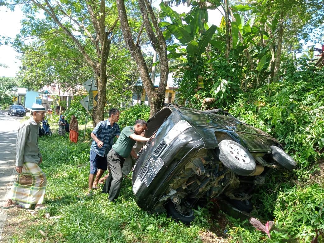 Tapi karena laju mobil kencang sehingga mobil terguling hingga keluar dari badan jalan.