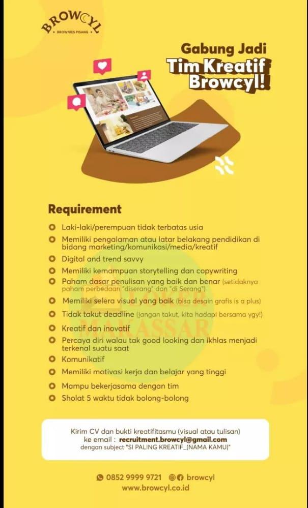 Pasalnya, Browcyl sedang mencari Tim Kreatif nih bagi kamu yang sedang nganggur dan mencari lowongan kerja Makassar.