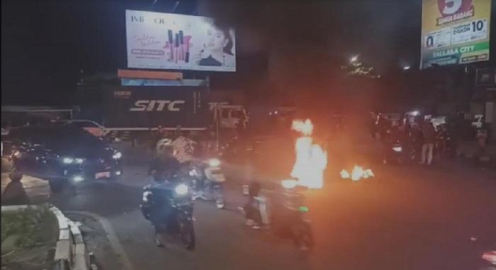 Pengunjuk rasa membakar ban tepat di pertigaan Jl AP Pettarani-Sultan Alauddin.