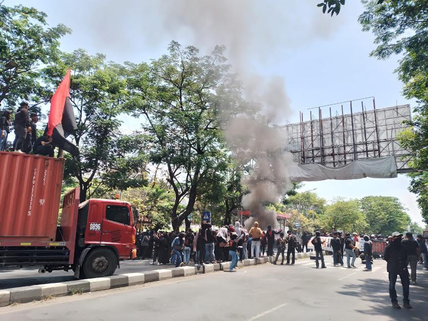 Terpantau, pengunjuk rasa memblokade dua jalur jalanan tersebut.