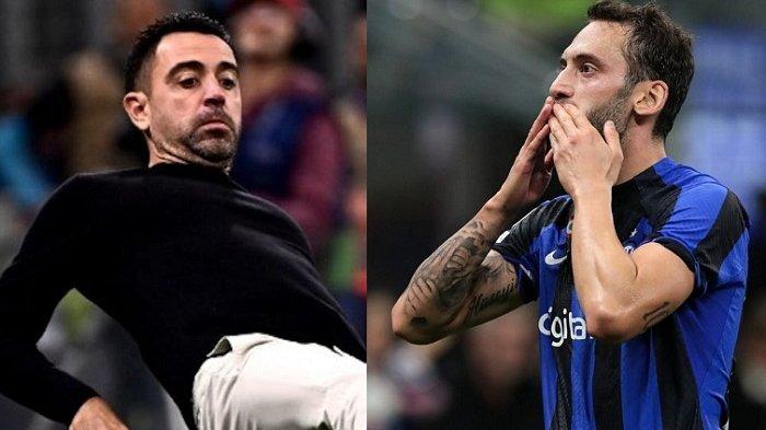 Manajer Barcelona Xavi Hernandez (kiri) dan pemain Inter Milan Hakan Calhanoglu (kanan). Barcelona menelan kekalahan 1-0 dari Inter Milan di laga Liga Champions 2022, Rabu (5/10/2022).
