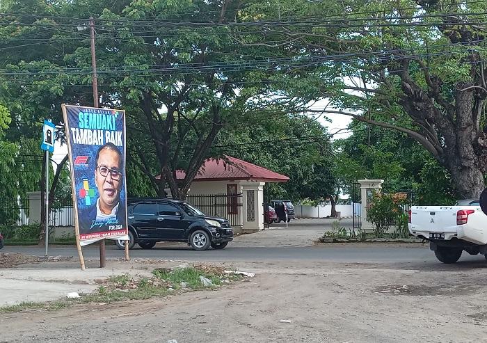 Wajah Danny bernarasi "Insya Allah Semua ki Tambah Baik" dan "For 2024" di depan Kantor Pengadilan Negeri Jl Pahlawan, Kecamatan Binamu, Jeneponto.